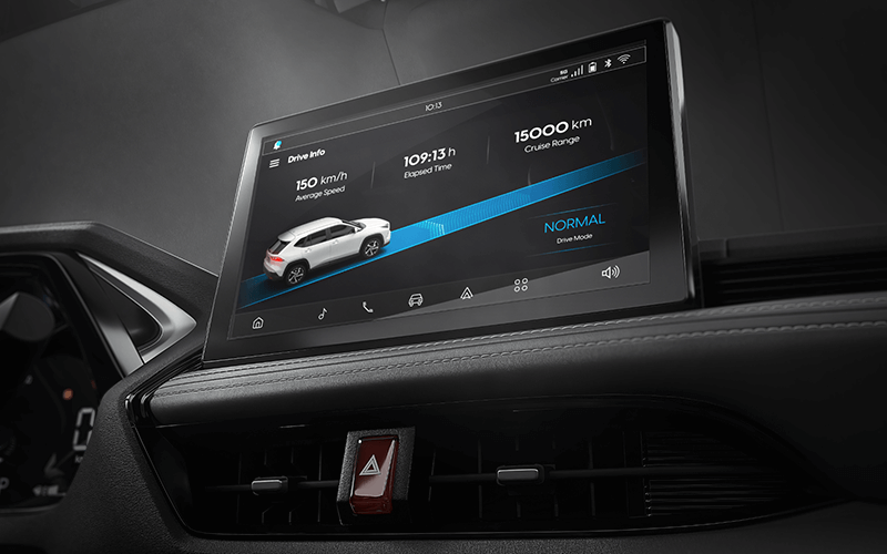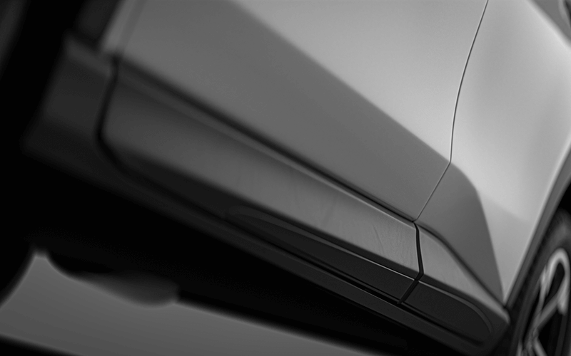 Design que combina robustez e fluidez para uma presença mais marcante, com rodas de 18" de liga leve com acabamento na cor preta, teto panorâmico fixo em vidro e revestimento de costura aparente no painel e portas com acabamento soft touch.